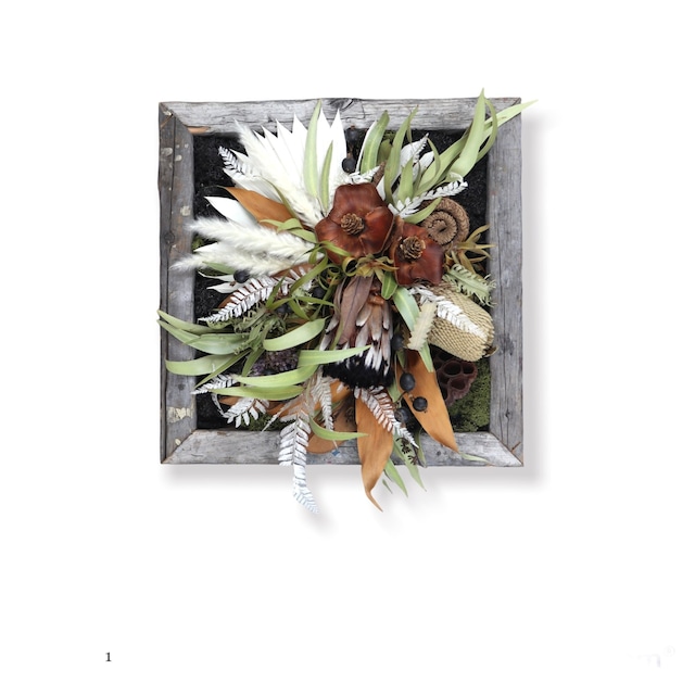 縦 44.3センチ 横 28.5センチ 厚み 13センチ フレーム厚み 5.5センチ <使用花材> バンクシヤ アロエ シダ マグノリア タルホーン グレビリア スターレンジャー ナンキンハゼ ## 予約オーダーメイド ドライフラワー壁掛け アンティーク ✴︎✴︎✴︎✴︎✴︎✴︎ 美しいドライフラワーを使用した壁掛けアートが、ついにご登場です。このアンティークなデザインは、どんなインテリアにも調和し、上品なアクセントを与えてくれます。天然素材を使用した壁掛けは、時を経た美しさを楽しむことができ、個々の作品が魅力的な特性を持っています。 お好みに応じたオーダーメイドが可能で、選んだ花材や色合いにより、あなたの個性を反映させた特別なアイテムに仕上げます。大切な方への贈り物や、ご自身のお部屋のインテリアとしても理想の選択です。特別な瞬間を彩るために、自分自身へのご褒美としてもお楽しみいただけます! 製品のサイズや使用する花材についても、ぜひリクエストをお寄せください。お好みの色合いやスタイルについてお聞かせいただければ、心をこめてお作りいたします。そして、上質な商品を手ごろな価格でお届けすることを心がけておりますので、安心してご注文いただけます。 不明な点やご不安なことがありましたら、どうぞお気軽にお問合せください。心を込めて、素敵なアイテムをお届けいたします!